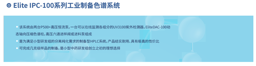 依利特科技的高壓半制備液相色譜系統(tǒng) EClassical3500/3700,巧妙融合了分析與半制備功能,為您打造一套完整的自動(dòng) HPLC 應(yīng)用方案,輕松應(yīng)對(duì)化合物的分析與制備需求。這套系統(tǒng)能讓分析與半制備之間的切換變得簡(jiǎn)單自如,樣品進(jìn)樣、餾分收集等工作也能有條不紊地完成。而依利特工業(yè)制備 Elite IPC 色譜系統(tǒng),從幾克級(jí)到十克級(jí)的樣品制備都能輕松勝任,無(wú)論是小型藥物研發(fā)團(tuán)隊(duì)還是大型純化實(shí)驗(yàn)室,都能在這里找到合適的選擇。?