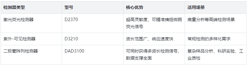 作為檢測信號的“捕捉者”,檢測器的性能直接決定了檢測結果的精準度。依利特旗下的檢測器系列堪稱行業標桿:D2370激光熒光檢測器,具備超高靈敏度,能精準捕捉微弱熒光信號,適用于痕量分析等高端檢測場景;D3210紫外-可見檢測器,波長范圍廣、響應速度快,滿足常規檢測的多樣化需求;DAD3100二極管陣列檢測器,可同時獲得多波長檢測信號,為復雜樣品分析提供更全面的數據支撐,無論是科研實驗還是工業質檢,都能輕松應對。