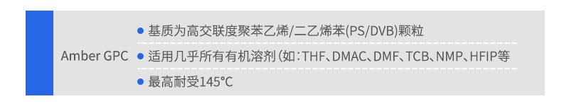 Amber GPC專為合成高分子的高效分離而設計,以具有極窄粒徑和孔徑分布的高交聯度聚苯乙烯/二乙烯苯(PS/DVB)顆粒為基質,孔徑分布均一,使分析中保留時間與分子量具有準確的線性關系。高交聯度的多孔顆粒具有優異的化學和物理穩定性,因此在更換有機溶劑時可以使分子量校正曲線的形狀及色譜柱的柱效幾乎保持不變。Amber GPC填料具有大的孔體積,可確保對聚合物分離有著高的分辨率。該填料既可以是單一孔徑的樹脂,也可以是不同孔徑樹脂的混合物。