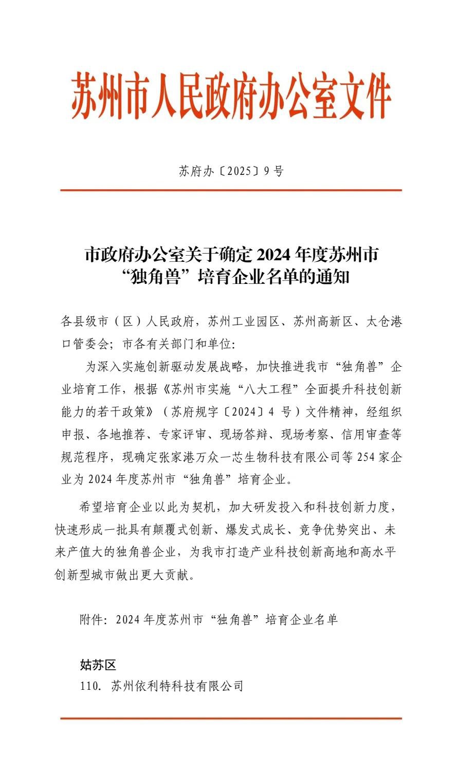 2025年2月11日,蘇州——近日,蘇州市政府正式發布《2024年度蘇州市“獨角獸”培育企業名單》,蘇州依利特科技有限公司作為姑蘇區首家且唯一入選企業,成功躋身這一具有戰略意義的創新梯隊。這一里程碑式突破,標志著姑蘇區在培育高成長性科技企業、構建現代化產業體系方面取得重要進展。