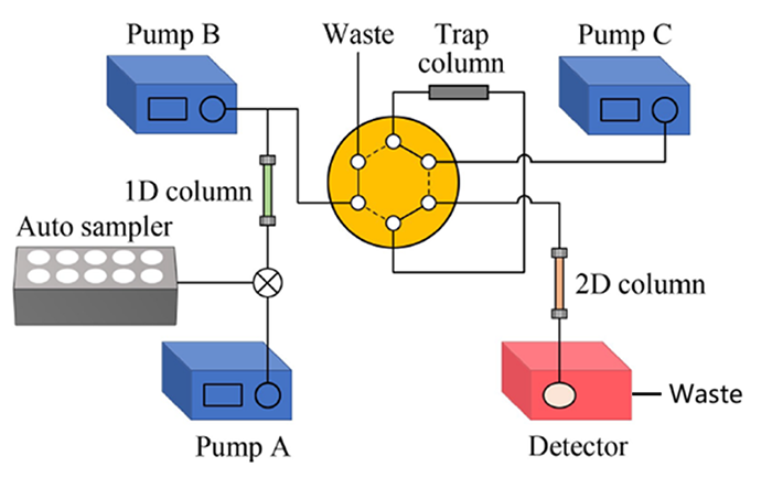 1、除雜質過程:初始條件下,進樣后A泵工作,切換閥處于實線通路,從第一維色譜柱(1D column)上洗脫的非待測組分通過切換閥排入廢液流路。