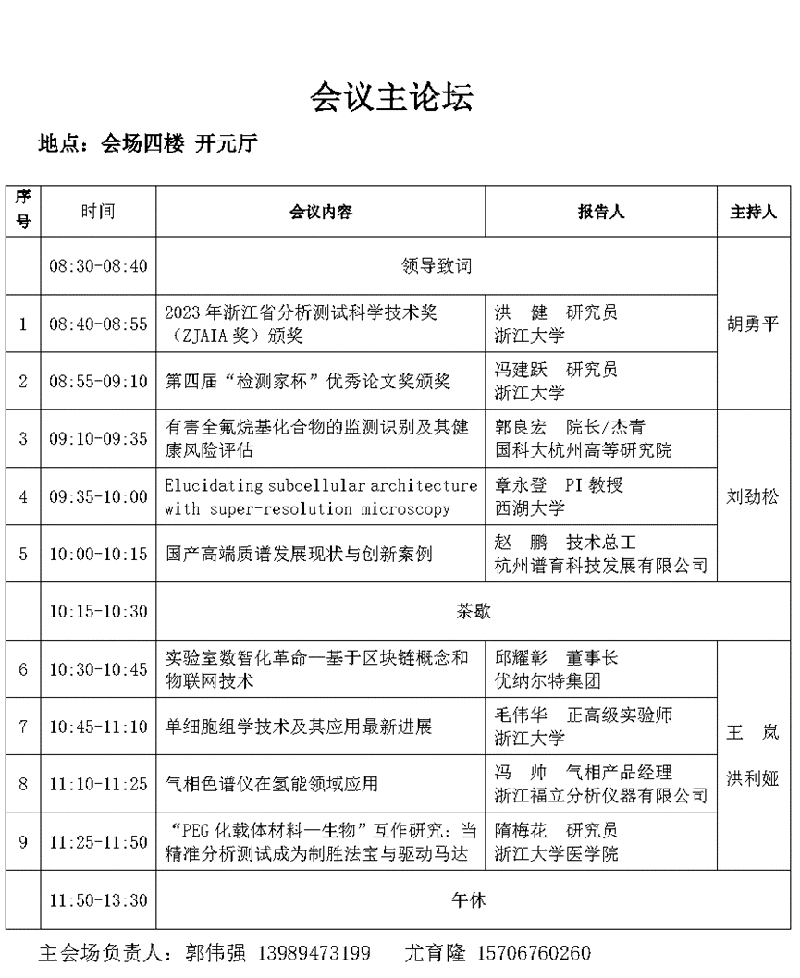 本次會議為期一天,上午設主會場,邀請了省內外知名專家學者作大會報告;下午設7個分會場:色譜與質譜分析、光譜與電化學分析、電鏡與微結構分析、細胞生物與生化分析、生物大分子分析、核磁共振波譜分析以及檢驗檢測機構等專業領域的專家學者及青年學者作分會場專題報告。會議還設有國內外廠商分析測試儀器及相關設備展區。