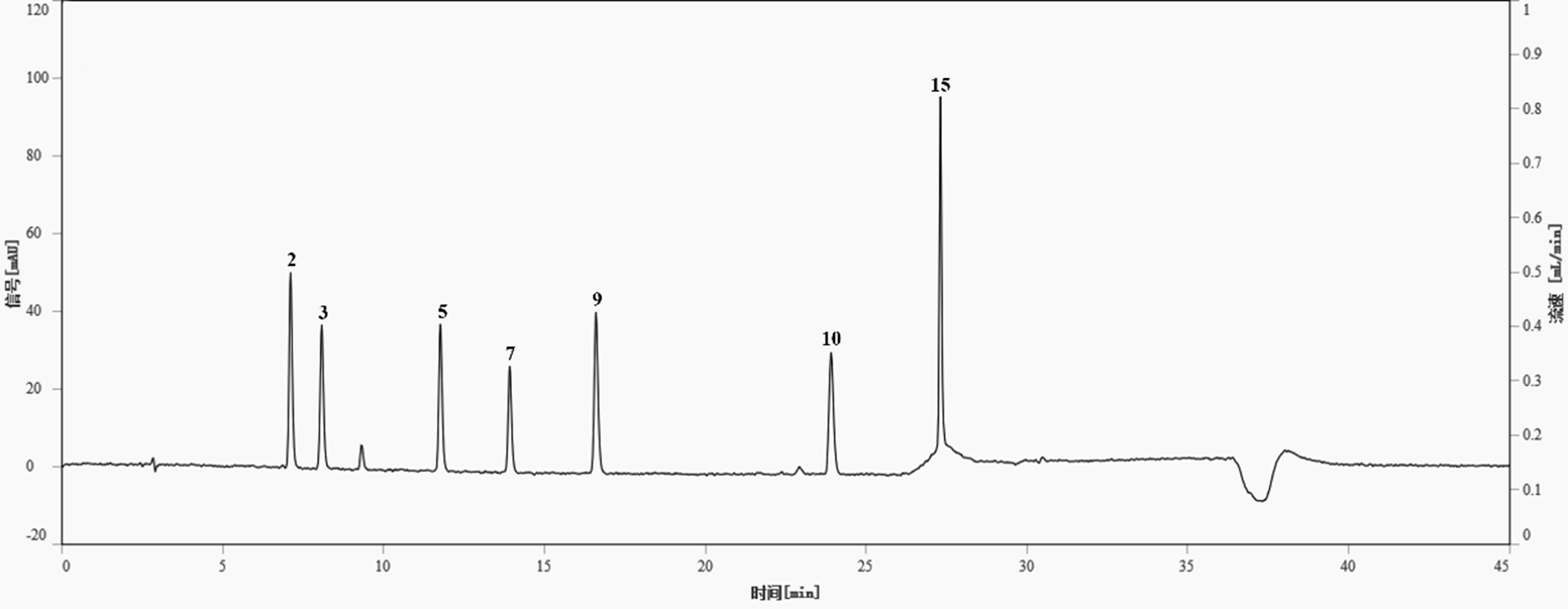 圖1 11種色素混標溶液色譜圖(10.0μg/mL,415nm)