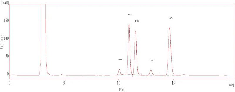 精密量取本品2mL,置100mL容量瓶中,用流動(dòng)相溶解并稀釋至刻度,搖勻,濾過,精密量取續(xù)濾液20μL,注入液相色譜儀,記錄色譜圖。