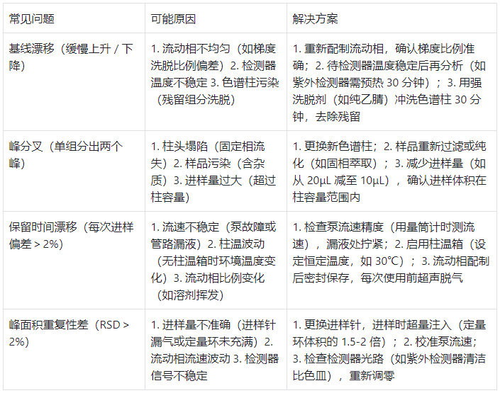 基線漂移:檢查流動相均勻性或檢測器穩定性。