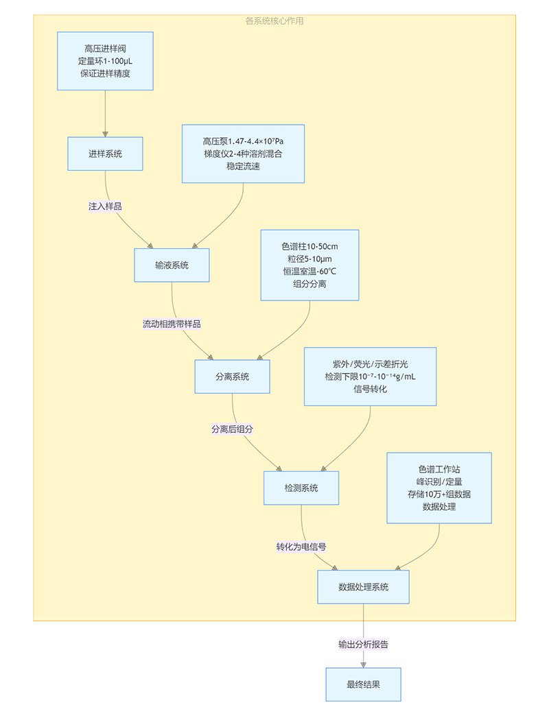 高效液相色譜儀主要由進樣系統、輸液系統、分離系統、檢測系統和數據處理系統五大核心部分組成。下面將帶您詳細了解這五大系統的功能與特點。