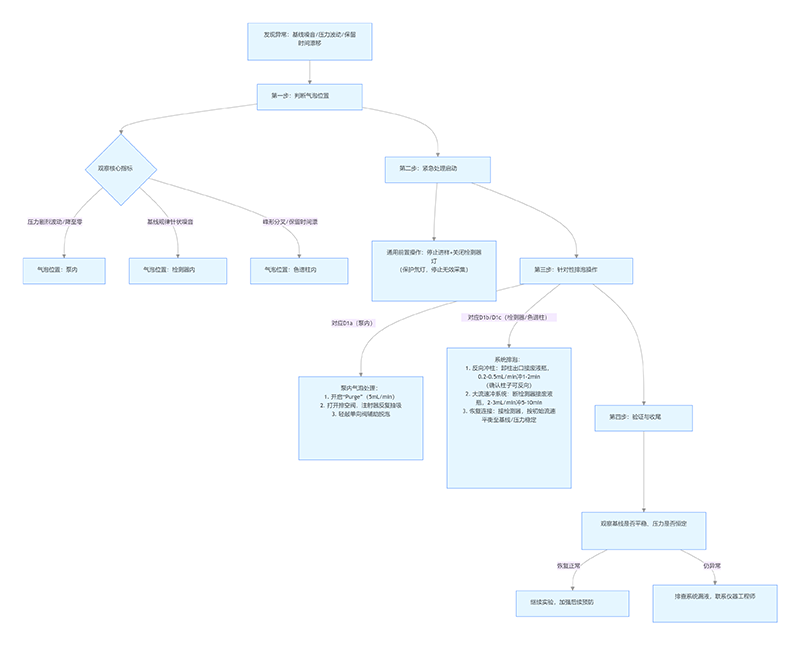 要是發(fā)現(xiàn)壓力波動(dòng)、基線有噪音,或者保留時(shí)間不穩(wěn)定,先別急著處理,得先搞清楚氣泡在哪個(gè)位置: