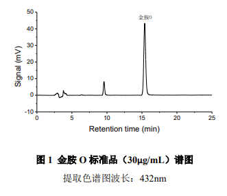 按照《中藥材及中藥飲片藥品檢驗補充檢驗方法和檢驗項目批準件》食藥監稽函 [2012] 200 號文件中金胺 O 檢測方法,使用大連依利特分析儀器有限公司配置 DAD230 + 二極管陣列檢測器的高效液相色譜儀可以分析檢測中藥材和中藥飲片中的金胺 O,系統穩定重復,線性相關性良好,檢出限低,通過光譜圖比對、峰純度計算功能,能夠準確定性,避免假陽性現象,滿足藥監部門制定的標準要求。