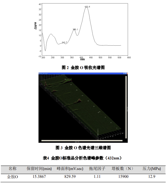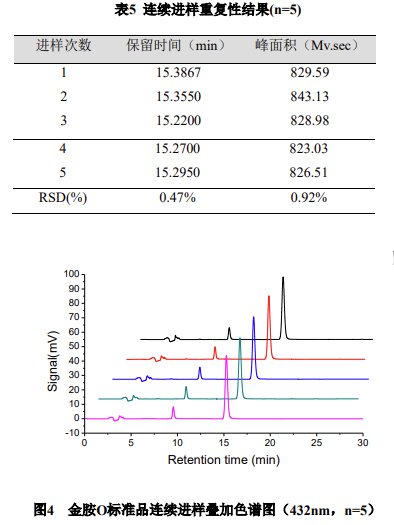 連續進樣 5 次,計算金胺 O 色譜峰保留時間和峰面積的 RSD 值,均小于 1%。
