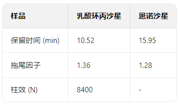恩諾沙星保留時間 15.85min,拖尾因子 1.26,柱效(N)達 8500,分離效果與重復性優異。