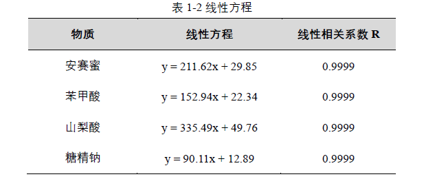 配制濃度分別為5μg/mL、10μg/mL、20μg/mL、30μg/mL、40μg/mL、50μg/mL、100μg/mL的標準工作液,按濃度由低至高進樣,以標準品濃度為橫坐標,峰面積為縱坐標,繪制校準曲線,安賽蜜、山梨酸、糖精鈉混合標準品的線性相關性結果如下。