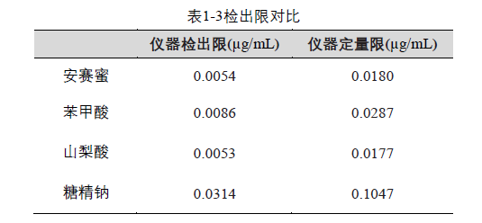噪聲按0.01mV計算,峰高為3倍信噪比對應的濃度為儀器檢出限,10倍信噪比對應的濃度為儀器定量限,結果如下表所示。