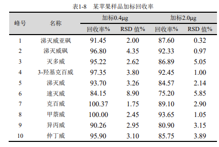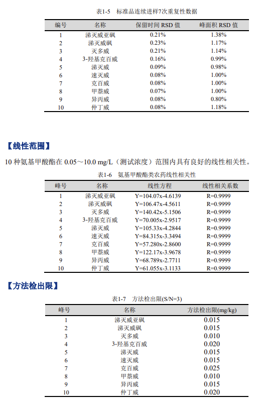 大連依利特分析儀器有限公司,結(jié)合《NY/T 761-2008 蔬菜和水果中有機磷、有機氯、擬除蟲菊酯和氨基甲酸酯類農(nóng)藥多殘留的測定》方法及相關(guān)文獻(xiàn)中關(guān)于農(nóng)殘測定的要求,建立的氨基甲酸酯分析系統(tǒng),提出了蔬果中氨基甲酸酯類農(nóng)藥殘留檢測的全套解決方案,并以蘋果為樣品進(jìn)行了檢測,實驗結(jié)果能夠達(dá)到標(biāo)準(zhǔn)中各項指標(biāo)要求。