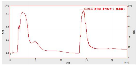 本實驗參考食品安全國家標準 食用油中極性組分 (PC) 的測定 (GB 5009.202-2016) 對食用油中極性組分 (PC) 進行測定,結果顯示食用油中非極性樣品峰結束時間在 6.7 min,符合 GB 5009.202-2016 標準要求。