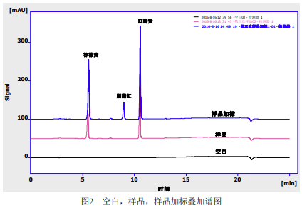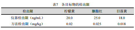 本系統的基線噪聲為25μV,根據3倍信噪比,儀器的小檢出限分別為檸檬黃20ng/mL,胭脂紅25ng/mL,日落黃18ng/mL。根據前處理方法計算,各目標物的方法檢出限分別為檸檬黃20μg/kg,胭脂紅25μg/kg,日落黃18μg/kg,參見表7。