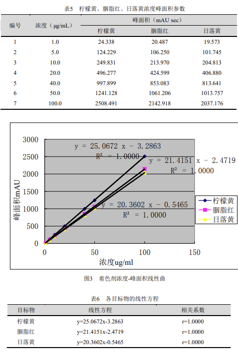 分別移取不同體積的標準儲備液,配制濃度為 1μg/mL、5μg/mL、10μg/mL、20μg/mL、40μg/mL、50μg/mL、100μg/mL 的標準混合工作液,按濃度由低至高進樣分析,以濃度為橫坐標、峰面積為縱坐標繪制校準曲線,檸檬黃、胭脂紅、日落黃的線性相關性結果如下: