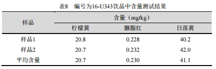 按照上述方法分析中國檢驗檢疫科學研究院測試評價中心提供的飲品(樣品編號16-U343),測試含量結果見表8。