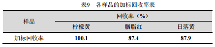 樣品中加入濃度為50μg/mL的混標溶液1mL,經過處理后分析,得到的各樣品的加標回收率見表9。