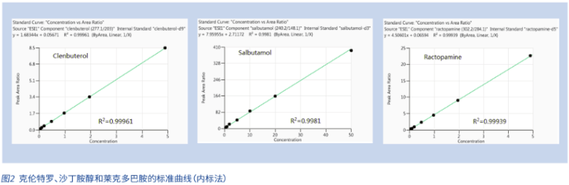 十三種 β- 受體激動劑在 0.05μg/L-5μg/L 濃度范圍內均呈現良好的線性關系,相關系數≥0.995,典型代表化合物克倫特羅、沙丁胺醇和萊克多巴胺的標準曲線(內標法)見圖 2。