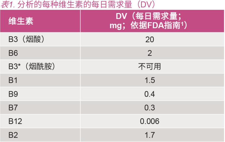 由于美國食品藥品監(jiān)督管理局 (FDA) 制定了這些維生素的每日營養(yǎng)推薦值,因此食品和補充劑生產(chǎn)商以及獨立檢測實驗室需要能夠定量鑒定該類產(chǎn)品中的維生素含量。在進行強化食品分析時,由于維生素濃度范圍較廣,與每日容許攝取量保持一致尤其具有挑戰(zhàn)性 (見表 1)。例如,在嬰兒牛奶中,維生素 B12 (氰鈷維生素) 的濃度為 1-2ppb,而維生素 B2 (核黃素) 的濃度則高達 1000 倍 (1-2 pm)。因此,任何定量分析方法都必須能夠適應(yīng)這種廣泛的濃度分布。