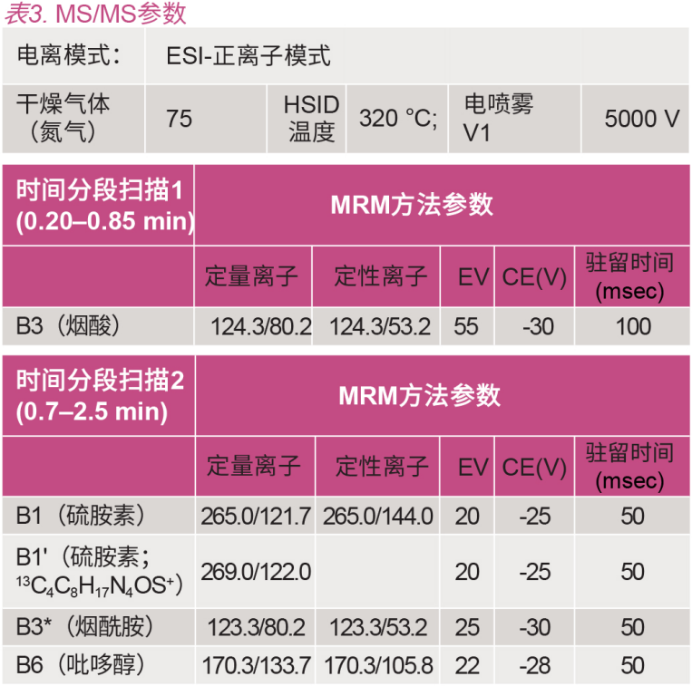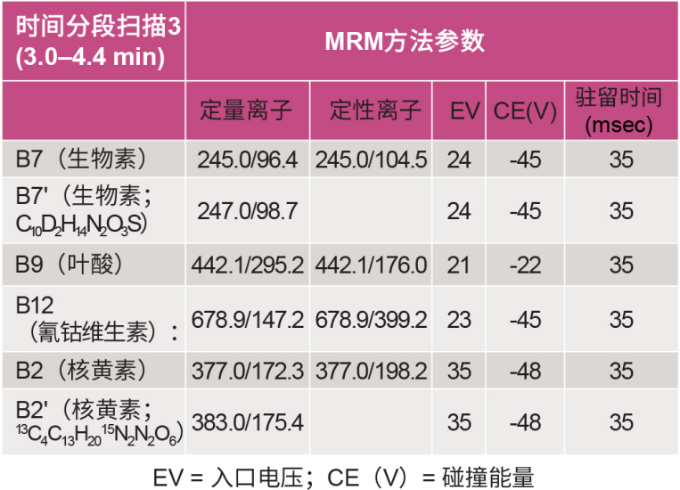 為了校準和定量,使用了三個內(nèi)標:維生素 B1"(硫胺素;?13C4?C8?H17? N4?OS+)、B7"(生物素;?C10?D2?H14? N2?O3? S) 和 B2'(核黃素;?13C4?C13?H2015? N2? N2?O6?)),全部來自 Sigma-Aldrich Inc.。校準 B3、B3*、B6 和 B1 時采用 B1',校準 B7、B9 和 B12 時采用 B7,校準 B2 時采用 B2。?