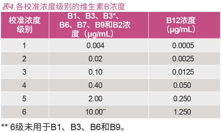 通過對工作標準品進行連續(xù)稀釋,制備 6 個校準濃度級別。獲得的維生素濃度見表 4。由于維生素 B12 的 DV 指南值明顯較低 (0.006mg),因此使用較低的濃度范圍對其進行校準。每批樣品運行前,分別移取各校準濃度級別標準溶液 50mL 至 50mL 容量瓶中,加入 50μL ISTD B1、B2 和 250μL ISTD B7,使內(nèi)標濃度為 0.1ug/mL。注:如果可用的任何校準濃度級別標準溶液低于 50mL,ISTD 應(yīng)相對可用量成比例添加。所有校準物均一式三份進樣。?