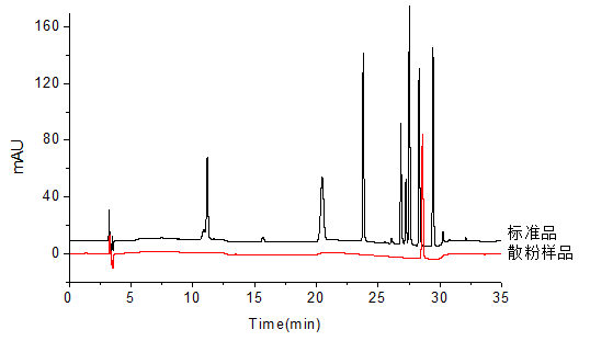準確稱取試樣5.0g(精確至1mg)于25mL比色管中,加入1.0mL四氫呋喃,加入20.0mL甲醇,在渦旋混勻器上高速振蕩5min,在超聲提取30min后,放置至室溫,用甲醇定容,搖勻,過0.45μm濾膜,待測。