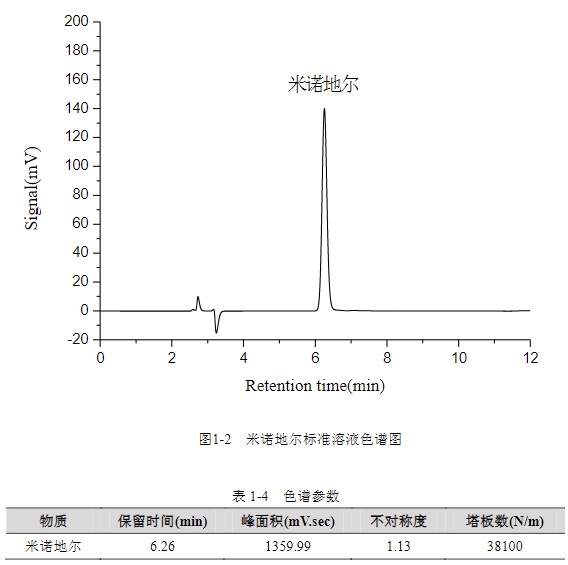 進樣分析濃度為 20.0mg/L 米諾地爾標準工作液,使用 1.3.3 中的色譜條件,結果如下圖所示:
