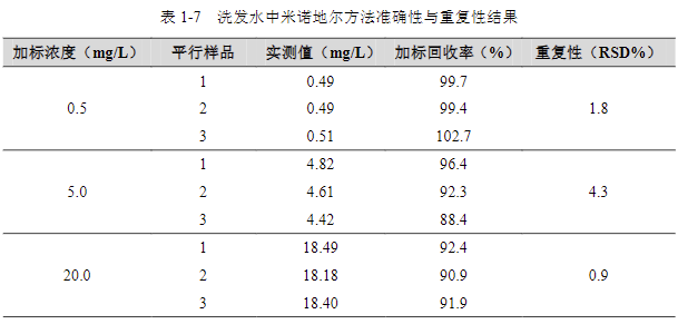 在添加濃度 0.5mg/L、5.0mg/L、20.0mg/L 濃度范圍內,測得回收率 88.4%~102.7%,相對標準偏差為 0.9%~4.3%。