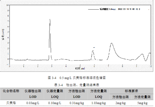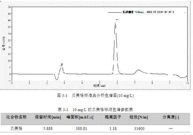 按 GB/T 40898-2021 標準中方法,配制貝美格的標準溶液,質量濃度為 0.5 mg/L、1 mg/L、2 mg/L、5 mg/L 和 10 mg/L 的五個標點,計算相關線性系數。