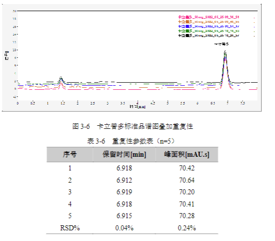 濃度為50 mg/L卡立普多 標準溶液,連續進樣 5針,峰面積和保留時間 RSD結果如下: