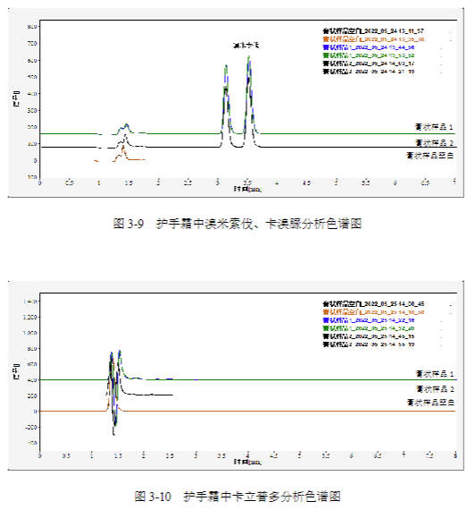 高清資料:圖 3-1 至 3-10 高清色譜圖(含峰型放大細節)、護手霜樣品加標譜圖;
