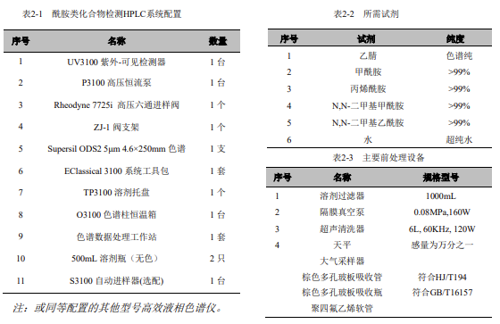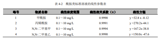 準(zhǔn)確稱(chēng)取 0.100g (精確至 ±0.0001g) 甲酰胺、0.100g (精確至 ±0.0001g) N,N - 二甲基甲酰胺、0.100g (精確至 ±0.0001g) N,N - 二甲基乙酰胺和 0.100g (精確至 ±0.0001g) 丙烯酰胺,用水溶解后全量轉(zhuǎn)入 100mL 容量瓶中,用水稀釋定容至標(biāo)線,搖勻。配制成甲酰胺、N,N - 二甲基甲酰胺、N,N - 二甲基乙酰胺和丙烯酰胺濃度分別為 1000mg/L、500mg/L、1000mg/L 和 500mg/L 的酰胺類(lèi)化合物混合標(biāo)準(zhǔn)貯備液,于 4℃以下冷藏、避光和密封可保存三個(gè)月,使用時(shí)應(yīng)恢復(fù)至室溫并搖勻。
