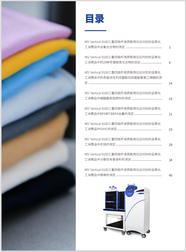 文集覆蓋紡織品等化工消費(fèi)品中 9 大類高關(guān)注度物質(zhì)的檢測(cè),適配不同基質(zhì)與法規(guī)要求,具體包括: