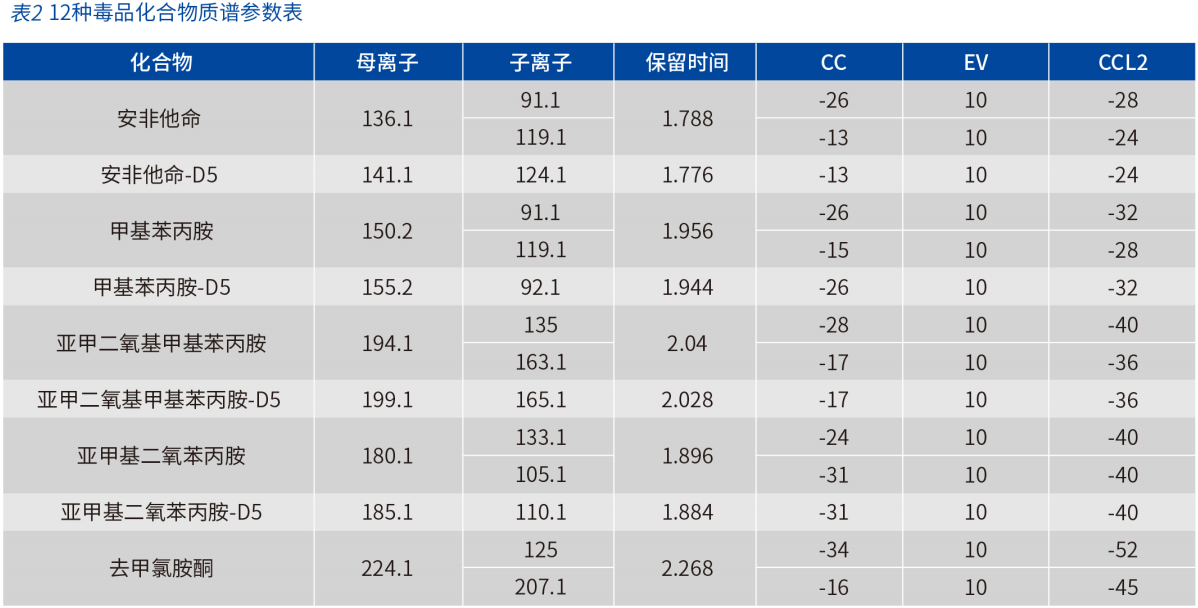以下參數(shù)以 EClassical 3200L-MS2 Vertical 9100 三重四極桿液質(zhì)聯(lián)用儀為例,目標(biāo)化合物質(zhì)譜參數(shù)見表 2。