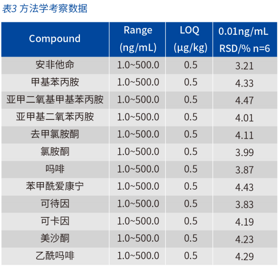圖1中展示了采用12種毒品的提取離子流色譜圖,經(jīng)色譜條件優(yōu)化,各個(gè)化合物的峰形對稱,獲得優(yōu)異的色譜分離效果,圖2是12種毒品標(biāo)準(zhǔn)曲線,表3為相關(guān)系數(shù)和檢出下限及重復(fù)性。