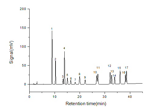 | 峰號 | 物質 | 保留時(min) | 峰面(mV·sec) | 不對稱度 | 塔板數(N/m) |