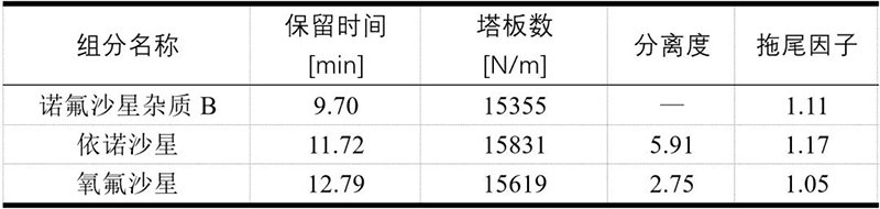 精確稱取依諾沙星標(biāo)準(zhǔn)品5mg、諾氟沙星雜質(zhì)B2.5mg、氧氟沙星2.5mg,置于同一100mL容量瓶中,加4mL0.1mol/L的鹽酸使溶解,加流動(dòng)相稀釋至刻度線,搖勻,即得。