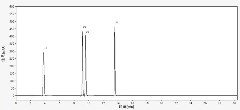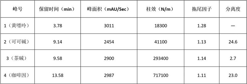 依利特新款的EClassical 3200液相色譜儀,搭配新款SinoPak BEH AQ-C18色譜柱,能很好的對咖啡因、可可堿、茶堿、黃嘌呤進行分析,且峰形良好,滿足定性定量分析的要求。