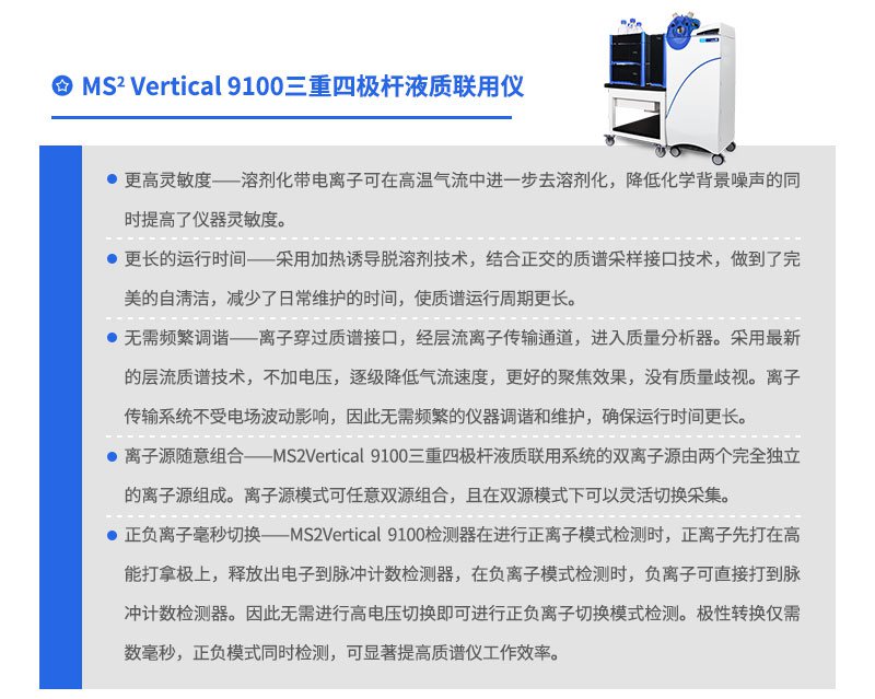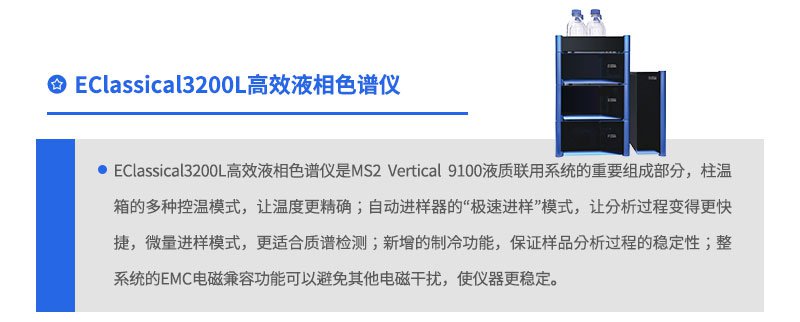 依利特MS2 Vertical 9100液質(zhì)聯(lián)用色譜系統(tǒng)用EClassical 3200L高效液相色譜儀與MS2 Vertical 9100三重四極桿質(zhì)譜儀聯(lián)用。充分發(fā)揮了EClassical 3200L耐高壓超高效液相色譜系統(tǒng)智能化、“極速進(jìn)樣”以及長期穩(wěn)定和精準(zhǔn)運(yùn)行的優(yōu)勢,同時結(jié)合MS2 Vertical 9100三重四極桿質(zhì)譜儀的高靈敏度、耐污染、雙離子源隨意組合、正負(fù)離子毫秒切換的特點,真正實現(xiàn)了快速、靈敏、便捷、穩(wěn)定的長期 LC-MS/MS測試運(yùn)行。