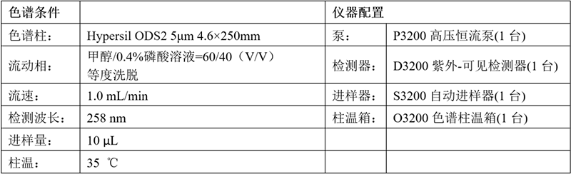 使用依利特新的EClassical 3200高效液相色譜儀,搭配Hypersil ODS2色譜柱,能很好檢測出目標物,且峰形良好,滿足定性定量分析的要求。