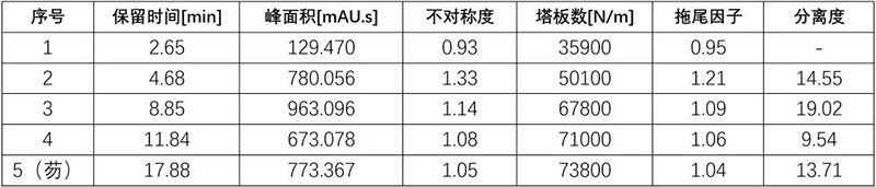 第400針的各峰的分離度與第1針的各峰的分離度比較。從數(shù)據(jù)看分離度沒有明顯變化,只有5號峰分離度略微變小,主要是因為4號峰樣品變質(zhì),檢出新雜質(zhì)而拖尾造成的。