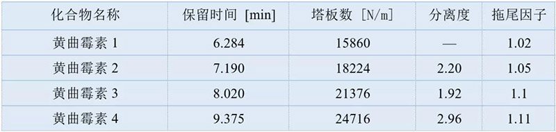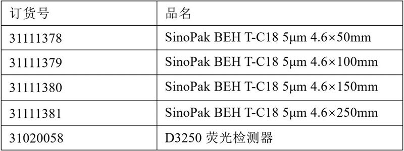 使用EClassical 3200高效液相色譜儀匹配新推出的SinoPak BEH T-C18色譜柱分析黃曲霉素樣品,柱效高,分離度符合要求,完全可以滿足黃曲霉素定性定量分析的需求。