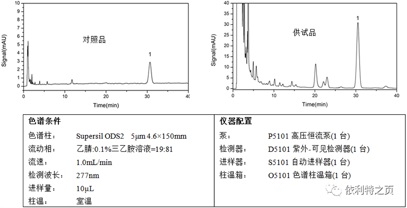 2.供試品溶液的制備:取裝量差異項下的本品,研細,取約2g,精密稱定,精密加入甲醇50mL,稱定重量,超聲處理(功率360W,頻率50kHz)30分鐘,取出,放冷,稱定重量,用甲醇補足減失的重量,搖勻,濾過,精密量取續(xù)濾液25mL,加在中性氧化鋁柱(100~200目,15g,內(nèi)徑為1.5cm)上,用甲醇25mL洗脫,棄去洗脫液,再用80%甲醇100mL洗脫,收集洗脫液,蒸干,殘渣加流動相適量,超聲處理(功率360W,頻率50kHz)2分鐘使溶解,轉(zhuǎn)移至10mL量瓶中,加流動相至刻度,搖勻,濾過,取續(xù)濾液,即得。