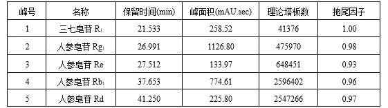 供試品溶液色譜圖中,人參皂苷Rg1與人參皂苷Re色譜峰的分離度應(yīng)大于1.5,理論板數(shù)按人參皂苷Rg1計算不應(yīng)低于6000。